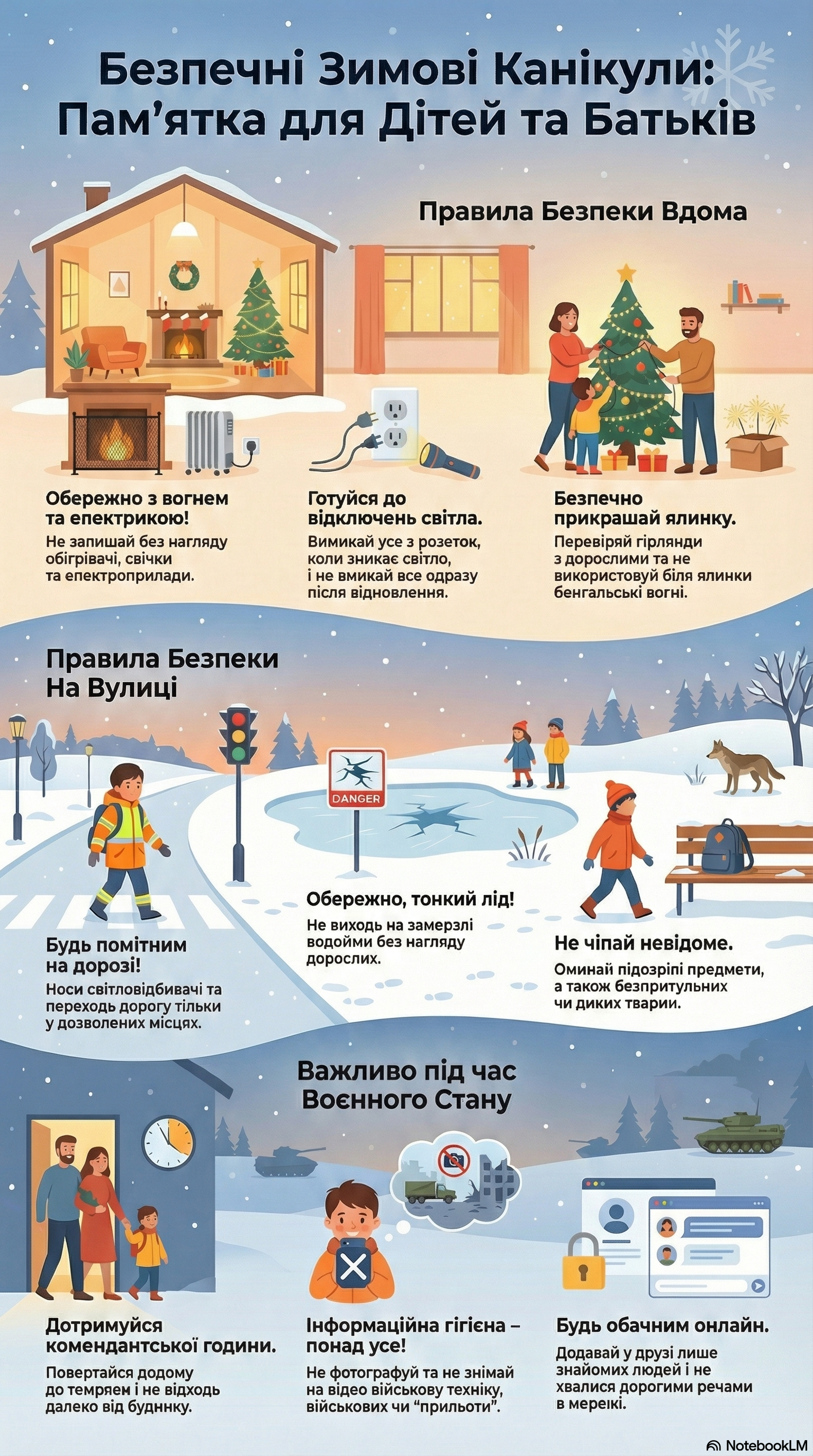 10. Дотримуйся правил безпечної поведінки при встановленні та користуванні новорічними прикрасами та ялинкою. Не забувайте, коли встановлюєте новорічну ялинку або прикрашаєте дім новорічними гірляндами, перевіряйте їх справність із дорослими, справність розеток та відсутність біля гірлянди легкозаймистих матеріалів/речовин. Ялинка не повинна перекривати вихід з кімнати. Відкритий вогонь та бенгальські вогні біля ялинки заборонені! Не прикрашайте фасади будинку новорічною ілюмінацією у період воєнного часу!